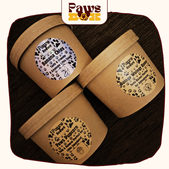 A box of our three best selling treat pots. Banana Chips - a natural treat for your dog. Boingy Woingy Bones - the perfect mid-walk reward. Paws Pupcorn - a little smackerel for rewarding any time.
