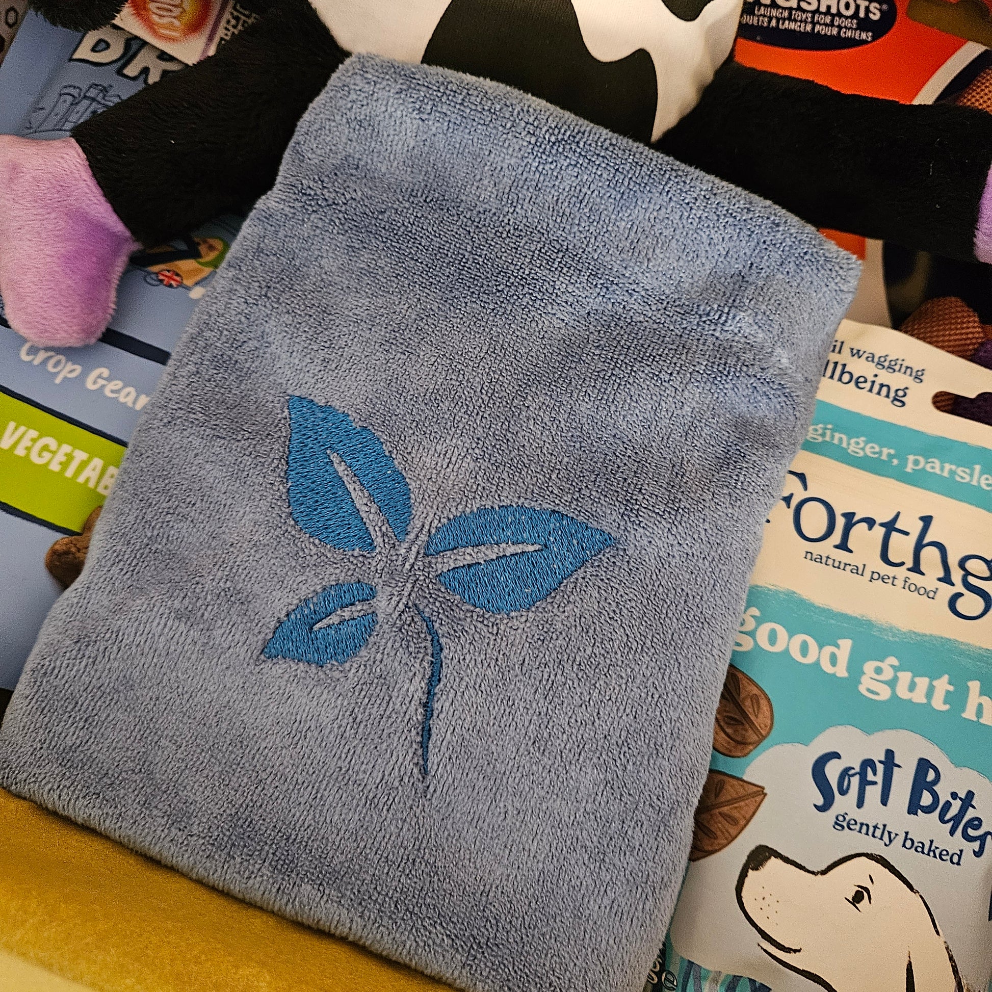 A dog towel embroidered with your single colour logo. Gift wrapped and sent to a special pooch.